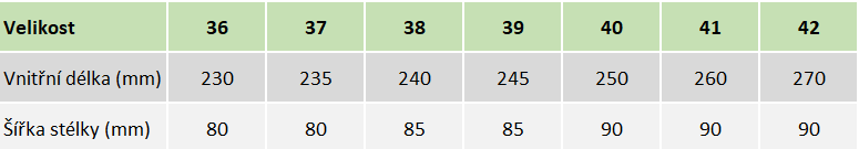 Nedoporučujeme se řídit pouze číslováním, protože se může mírně lišit u každého modelu, a proto je pod každým modelem (v popisu produktu) tabulka s přesně naměřenou vnitřní délkou, abyste si mohli vybrat ty správné boty pro Vás.
