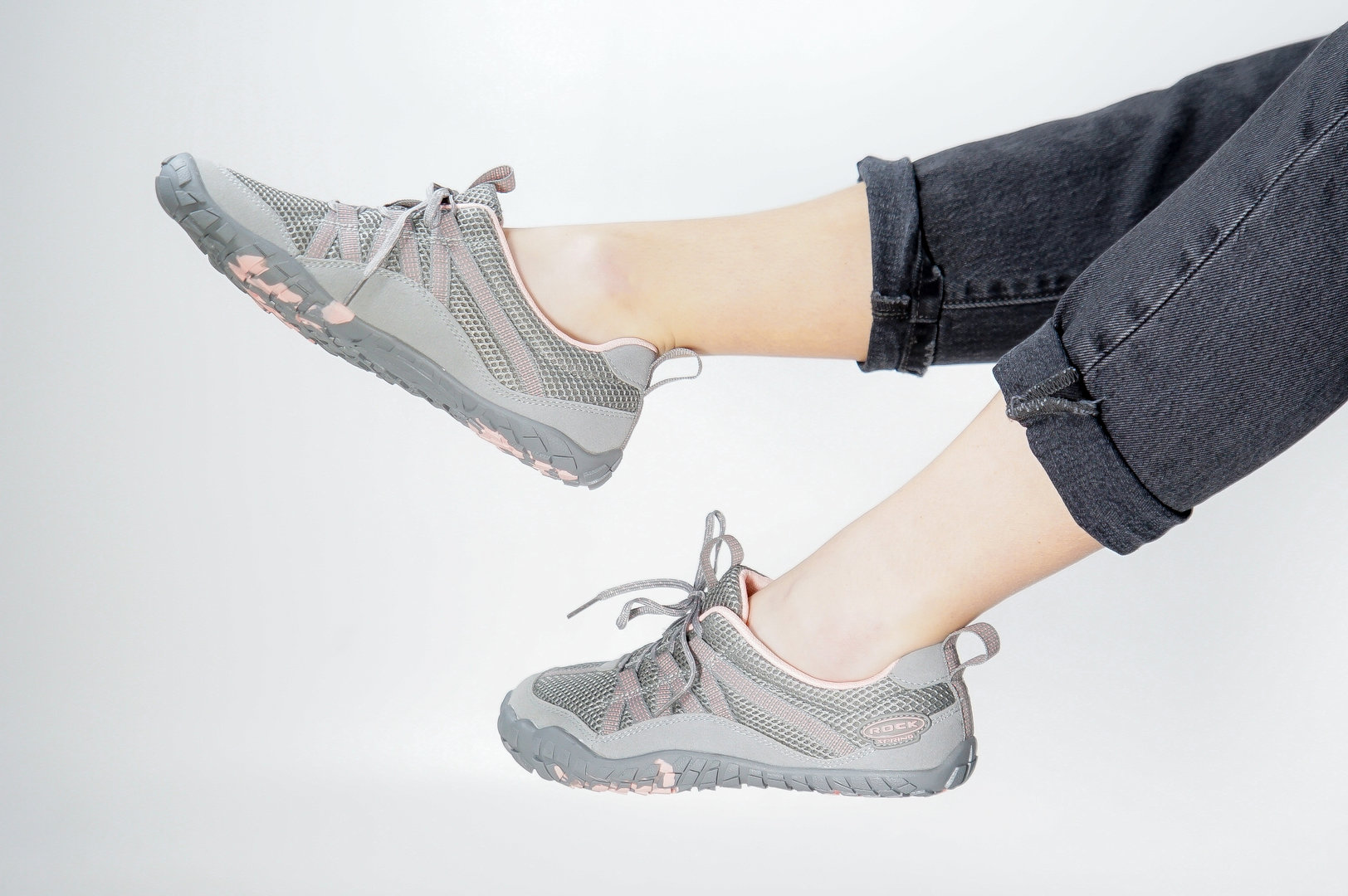 Podešve jsou protiskluzové, pružné a velmi lehké s naším autentickým designem ROCK SPRING.