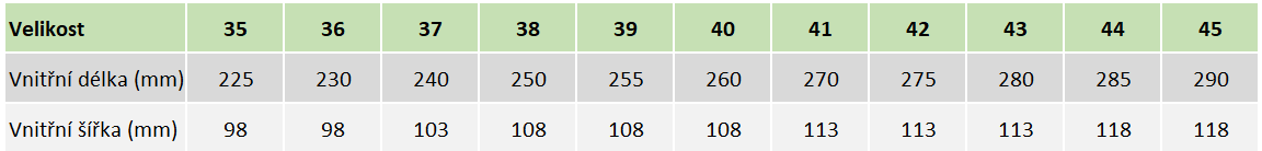 Nedoporučujeme se řídit pouze číslováním, protože se může mírně lišit u každého modelu, a proto je pod každým modelem (v popisu produktu) tabulka s přesně naměřenou vnitřní délkou, abyste si mohli vybrat ty správné boty pro Vás.