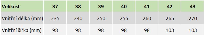 Tabulka velikostí:
