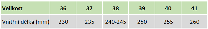 Nedoporučujeme se řídit pouze číslováním, protože se může mírně lišit u každého modelu, a proto je pod každým modelem (v popisu produktu) tabulka s přesně naměřenou vnitřní délkou, abyste si mohli vybrat ty správné boty pro Vás.
