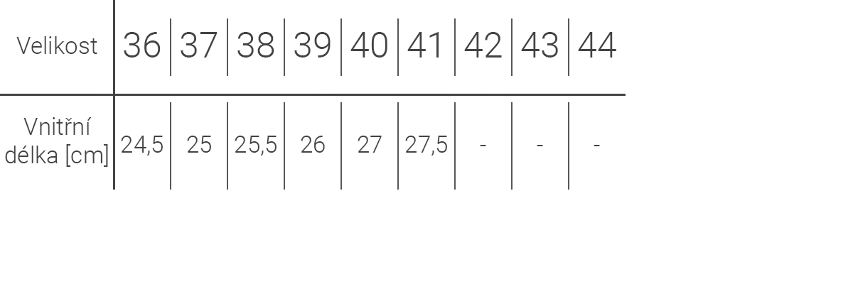 Nedoporučujeme se řídit pouze číslováním, protože se může mírně lišit u každého modelu, a proto je pod každým modelem (v popisu produktu) tabulka s přesně naměřenou vnitřní délkou, abyste si mohli vybrat ty správné boty pro Vás.