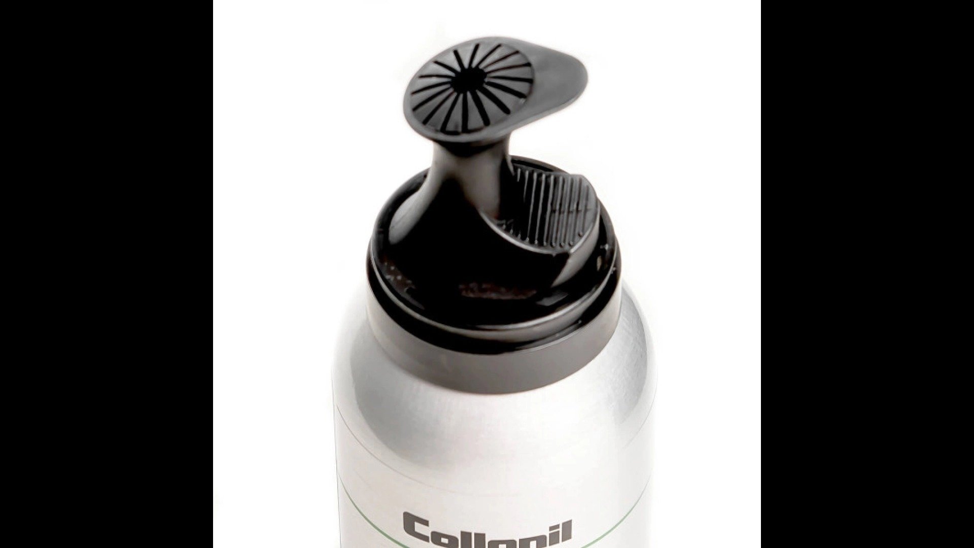 Nádobku držte svisle hlavou dolů a naneste pěnu na houbu/hadřík (pro hladkou kůži) nebo na kartáček (pro semiš/nubuk/textil).